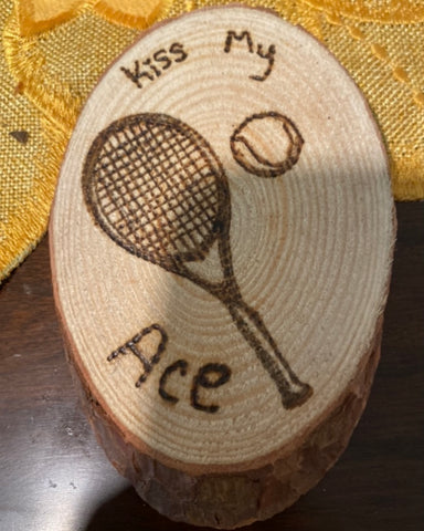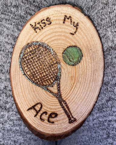 Before any woodburning can be painted, it must first be designed and burned in. While this might seem like an obvious step, it is important to think about where you might want to add color in your piece and to what extent. Thinking about these things ahead of time will make your creative process flow a bit easier as your wood burned lines will not get ‘covered up’ by watercolor when the time comes. Do you want one color to stand out or do you want a blend of colors? Do you want the natural wood grain to poke through the color or do you want the colorr to saturateto completely cover? Do you want a matte finish to your color or a more shimmery/glitter finish? These are important things to consider before even touching a paintbrush to your wood burned design. As you can see, I sketched out my design lightly and then plainly burned in the part (tennis ball) I knew I would be adding color to.