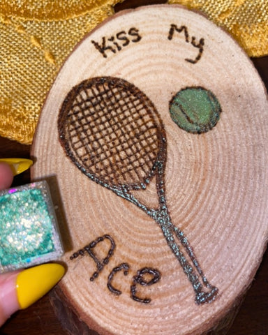 The texture of glitter watercolors does add a learning curve, as they don’t paint on wood like other watercolors do, but don’t let that deter you! Grab her glitteriest of shades and push yourself to try something new! The shimmer of the watercolor adds a new dimension to the woodburnings, causing them to catch and reflect light in ways wood does not naturally. Adding something like that can bring focus to one part of the piece specifically like I did above with the tennis ball. By having an idea ahead of time, I could plan where I wanted the pop of color exactly and what color I needed to achieve that. Mixing the matte neon with the glittery “meadow” was the perfect way to achieve the tennis ball effect I was going for. The matte neon bumped the glittery shine of meadow down a little which helped give it a more realistic feel for a fuzzy tennis ball. If you haven’t caught it already, the next pro-tip is to mix your shimmer watercolor with a matte one to dial down the shimmer effect!