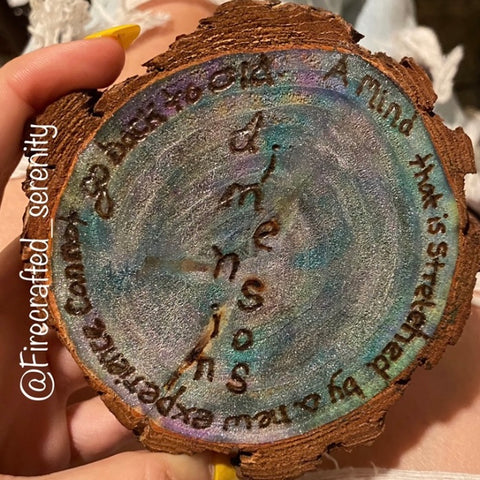 In this example, I wanted to show you the true visual difference alone in how adding watercolors of various layers impacts the piece. Starting off, you have your blank canvas of a woodburning design. In this example, I have a little mandala design woodburnt out, just begging for some Waves Of Expression watercolors to be added! While this blank piece is still beautiful, it has so much potential that is untapped without the added color.