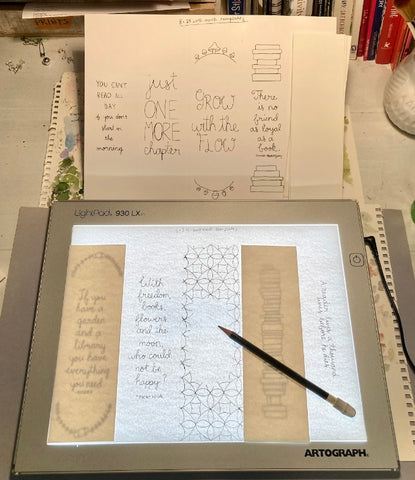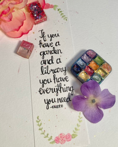 Now to pick a topic you want on your bookmark. Some of my favorites are 1) floral wreaths with quotes about books, by famous authors, or from my favorite books, 2) nature scenes like land-, sea-, or skyscapes, and you can really show off your love of books by painting on your bookmark 3) a stack of books!