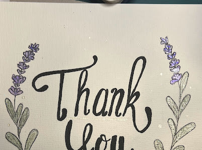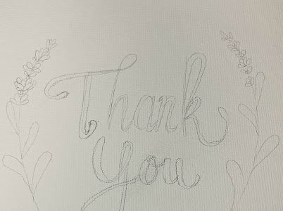 I started this thank you card, by searching the phrase thank you and looking at different fonts online. Once I found one I liked that I can add my own flare to, I sketched out the words in pencil. I also wanted to add some flowers to the side as well. I choose lavender flowers because I’m a Taylor Swift fan and the song Lavender Haze has been on repeat in my head for the last few weeks. That and purple can have a nice variety and range to bring out more details and have a comforting feeling for the card as well.
