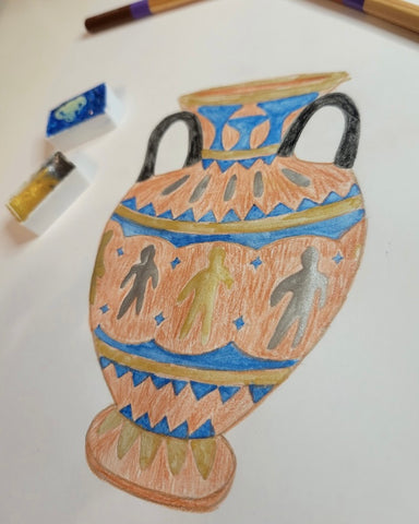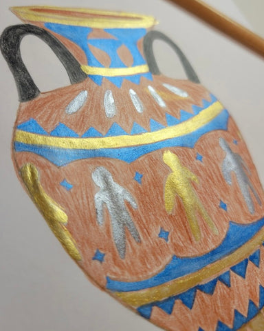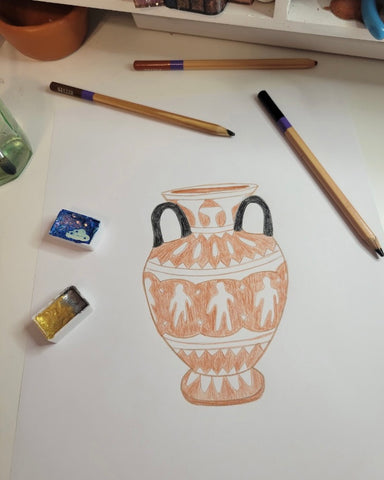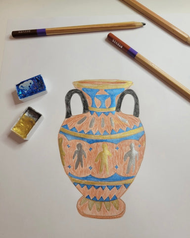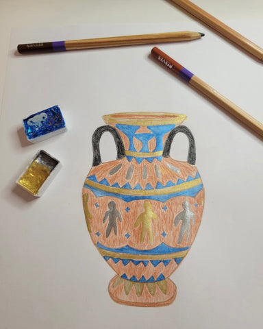 I started by sketching out the pot with a pencil. Once I had the design ready, I started coloring the main areas with colored pencils.
