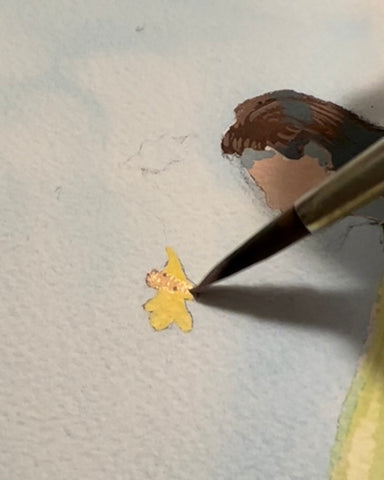 I want this painting to illustrate the changing of the seasons, and the beginning of fall, so naturally we want to emphasize the first leaves about to fall! I’m using Amber from the Hidden Gems Collection and Hera to create a two-tone rose and gold shimmer on the foliage that has begun to yellow.