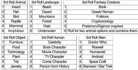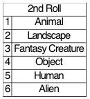 Next is to refine it a little to get a more specific subject matter. Again, Charts below. I was using a brand-new dice and it gave me two again; after rolling more, it does seem like it favors two when rolled gently, but I will still go with it. That means I will be painting a desert. If you roll 6 for Fantasy Creature, go to the animal chart, roll your dice twice and combine the two animals you get.