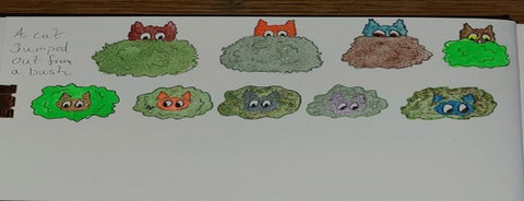 First, I am going to start with the goofier of the two characters for a children’s book illustration. I have a cat that is going to jump out of a bush to chase the characters. For the first page of the cat’s appearance, I thought it might be cool to see it poking out of the bush. Just to try the poking out effect, I tried two concepts looking over the bush and through the bush. I then draw out multiple versions, but kept the expression blank.Expressions can transform the look of something, but I wanted to look at the colors alone affecting the look without the influence of the expression. Do not be afraid of trying a crazy color. Children often enjoy more fantastical representations of things.