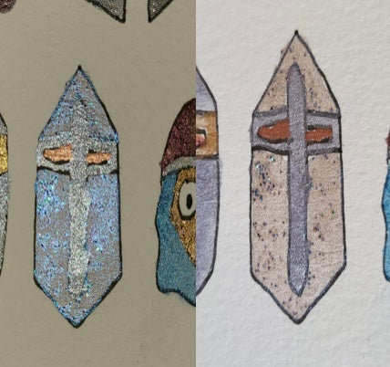 You could start off with the skin tone, or start with the helmets as I did. Remember, these are just brainstorms and not the final piece. Try experimenting. I did do a few more traditional metallic looking ones, but I also experimented with maroon, blue, and a light grey which shines blue in light. Could the character’s world have metal which is a different color?