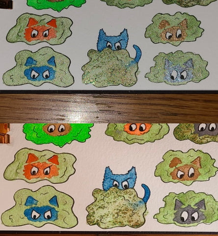 Once I have a few colors I think will fit what I am going for, I try them again with different expressions. These expressions do change how the color seems to fit what I am going for. In the end, I didn’t decide on a final color scheme, but trying out a few different iterations has helped me decide the color: either orange or a mischievous grey. Perhaps, I will try to figure out a way to make it shine different when the page is turned.