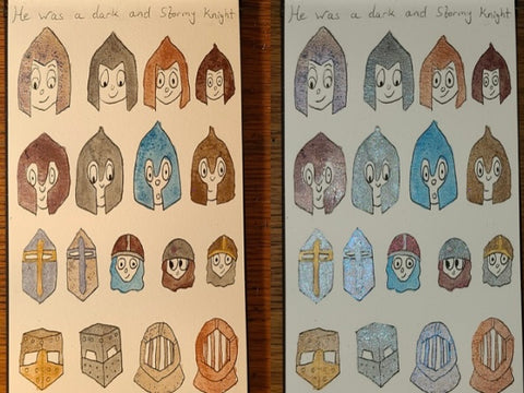 Next, I tried out some skin tones and really stepped out of our world’s norm. Could alien colors work and make the story more science fiction? The story could be more of a fantasy with the knight being some type of fairy with green skin. Is it dark and stormy because of a menacing black stare from the helmet eye holes or because they have grey skin? Maybe they have glowing neon pink eyes.
