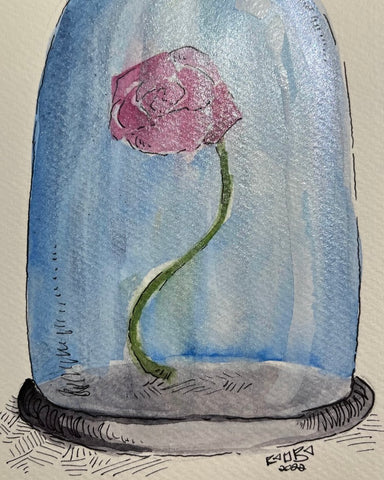 See how we get this gorgeous frosted look of the glass in front of the flower? This is a great quick way to give your illustrations some dimension. You can also the same technique of washing shimmery watercolors onto your art for other transparent objects: the glass of windows, looking through water, the lenses of glasses and sunglasses, and more!