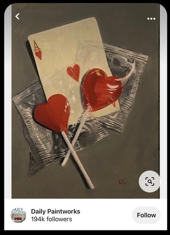 Next, I build up those layers of red and blue, and begin adding some details. I add in a slightly darker shade of red to the left side of the hearts and start creating the illusion of a plastic wrapper. Keeping the paint light, I add thin lines of blue to the top, bottom, and sides of the wrapper, along with an outline around both suckers in blue. I tried to pay attention to the sucker’s sticks and where highlights were hitting in my reference, but I kept it relatively loose.