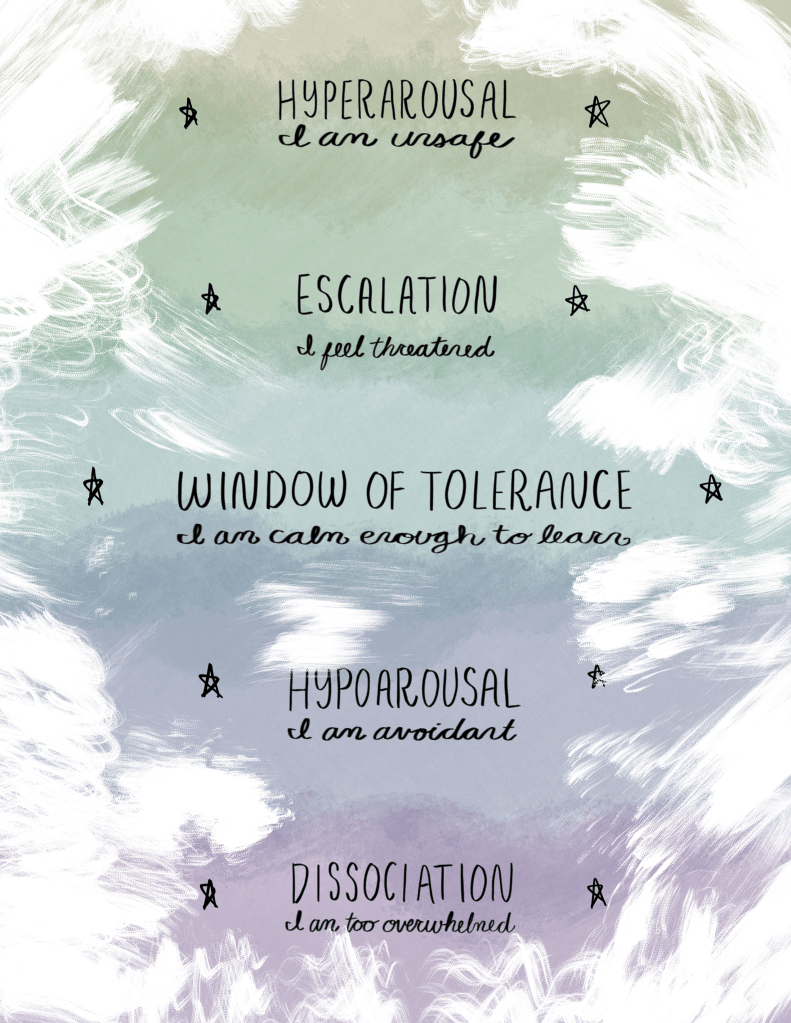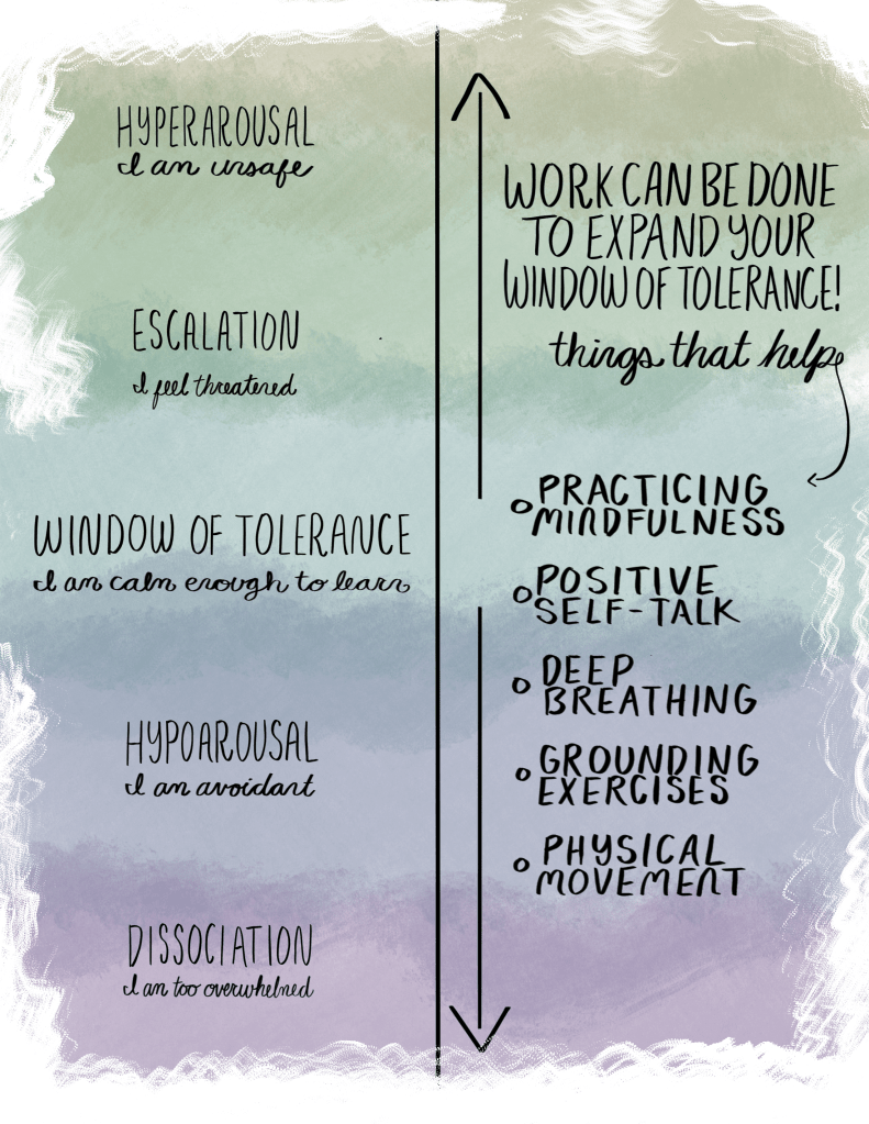 When we move outside of our window, our nervous system becomes overwhelmed. This can look like escalating into hyperarousal (fight/flight) or dropping into hypoarousal (freeze/avoidance). Over time, with awareness and practice, we can both return to and expand our window of tolerance—allowing us to navigate life with more compassion for ourselves and how we are feeling.