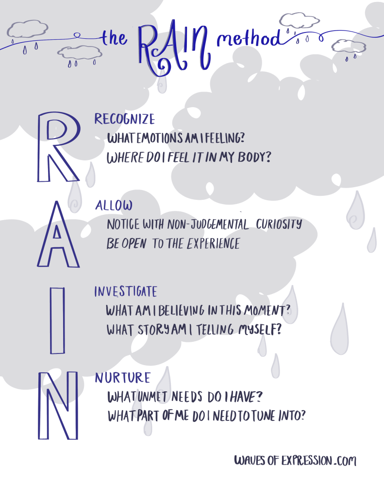 REMINDER: the RAIN method is not about erasing difficult emotions, but about meeting yourself with gentleness and curiosity. With practice, it becomes less about weathering a storm alone and more about discovering you can hold the umbrella for yourself.