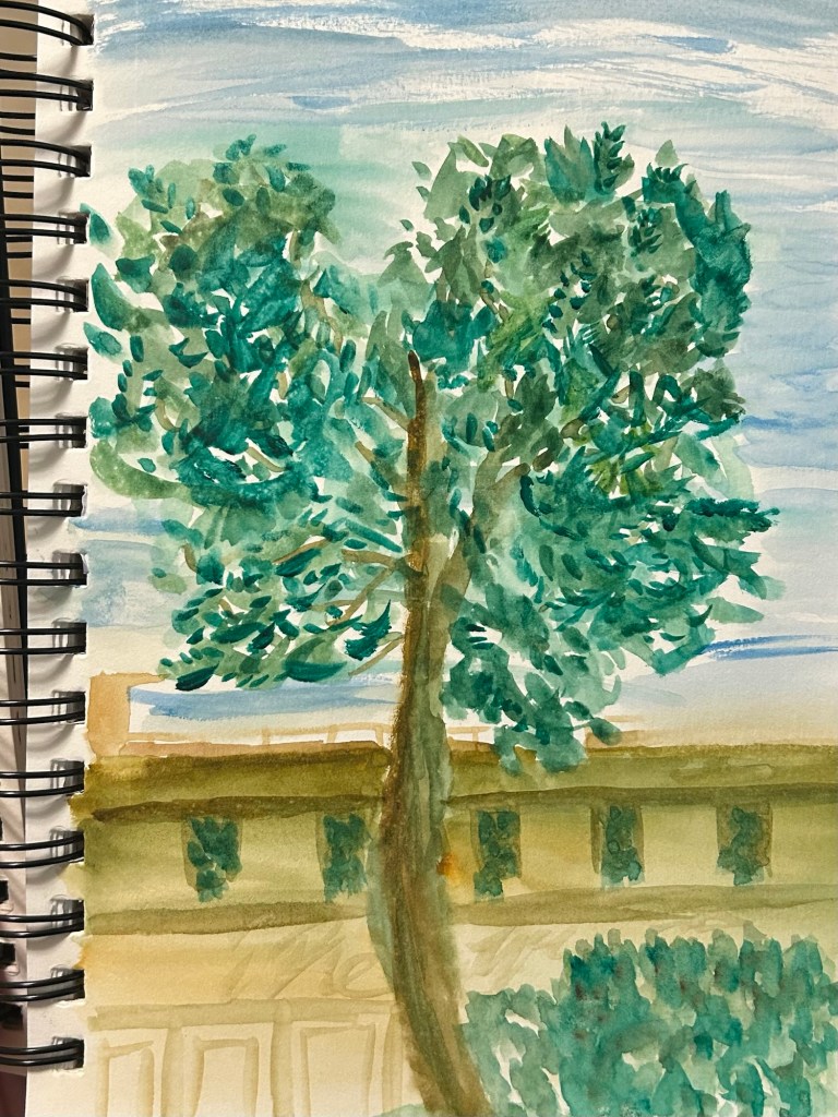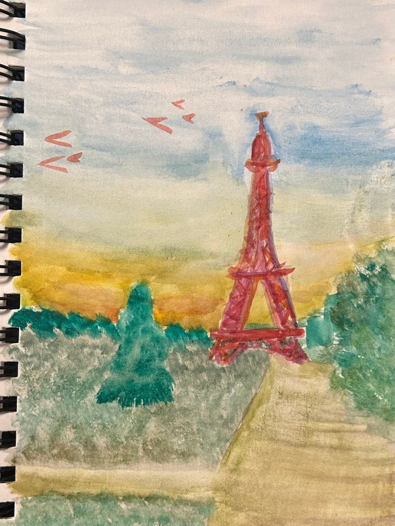 The final piece I created during our Paris trip was of a tree outside the Arc de Triomphe. While the Arc itself is surrounded by high-end shops featuring some of the fanciest brands imaginable, my memory of the moment is far less glamorous and far more special. Our group stopped at a restaurant where the plates were about forty euros each. My friend and I—apparently the only ones traveling on a budget—looked at each other and said, “Nope.” A kind chaperone walked us over to McDonald’s instead, where I had the best potato wedges of my life. We sat on a nearby bench, in full view of our teacher and tour guide, who were enjoying coffee. As we ate and people-watched, my friend and I pulled out our paints and chose a tree to capture.