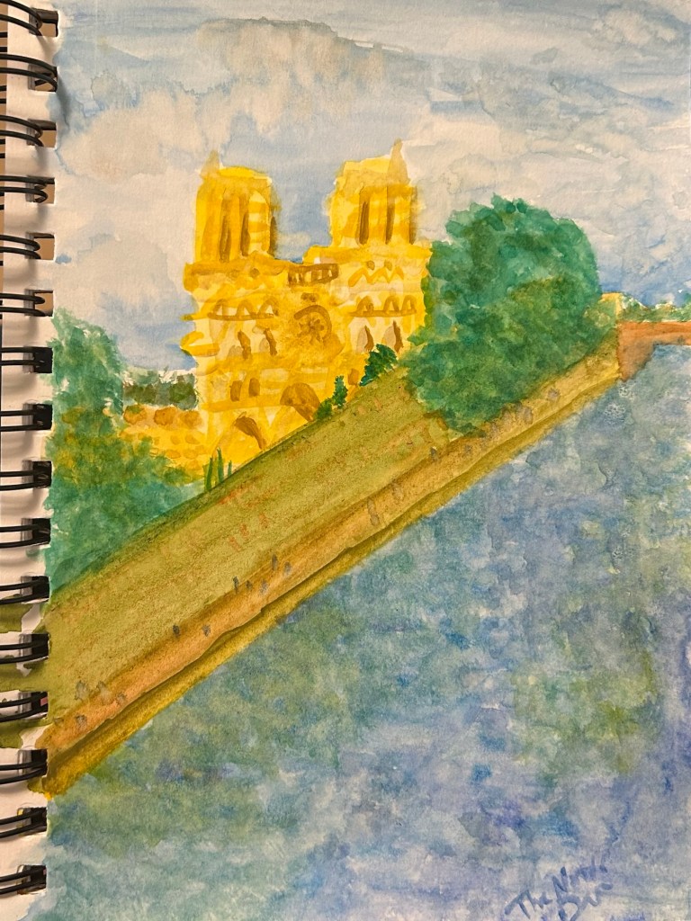 Notre Dame: this piece was created from the closest view I was able to get. I traveled to Paris with my art history class, and we had spent the entire semester studying European art—including the majesty of Notre Dame. Just a few months before our trip, we turned on the news and saw the cathedral in flames. Our class mourned the loss and grieved that we wouldn’t be able to explore it up close. Still, we managed to get as near as this painting captures. Looking at it now, I feel both the sadness of being so close yet so far, and the peace of having experienced that moment with my classmates—finding comfort, fun, and even joy together despite the loss.